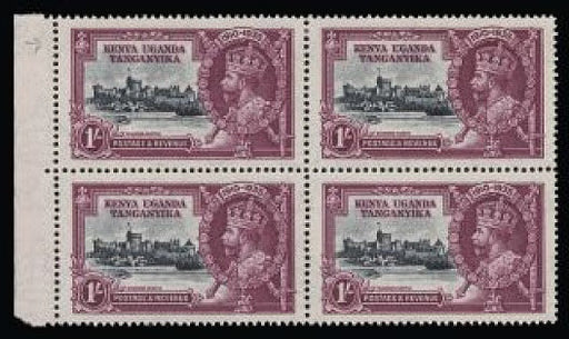£140.00| /Kenya, Uganda and Tanganyika 1935 Silver Jubilee 1s slate and purple, left marginal block of 4 showing variety 'line through 'O' of 1910' on upper ...