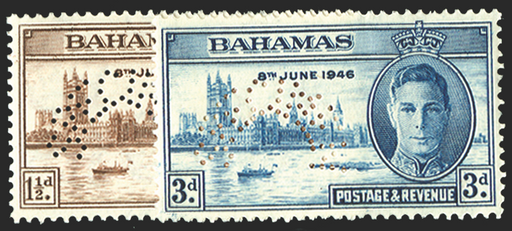 £75.00| /Bahamas 1946 Victory 1½d brown and 3d blue, perforated 'SPECIMEN' (type D21), SG176s/7s. Brilliant quality mint examples with original gum. The 3d...
