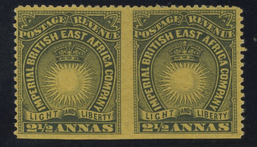Sale SaleBritish East Africa 1890-95 2½a black/yellow-buff error, SG7a£8,000.00| /British East Africa 1890-95 2½a black/yellow-buff error, from 1891 first printing on thin paper, horizontal pair, ERROR IMPERFORATE BETWEEN (and at... View full details£8,000.00| /Sale