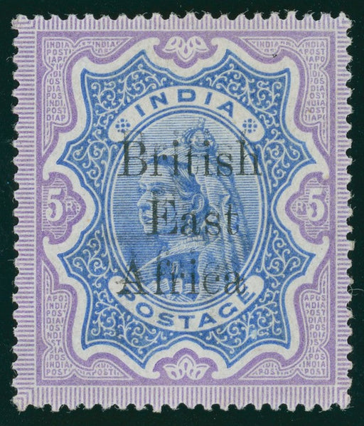 Sold out Sold outBritish East Africa 1896-1901 5r sepia SG79a£1,800.00| /British East Africa 1896-1901 5r sepia, showing the prominent pantograph variety 'Thin U in RUPEES', brilliant large part original gum. Only 84 pos... View full details£1,800.00| /Sold out