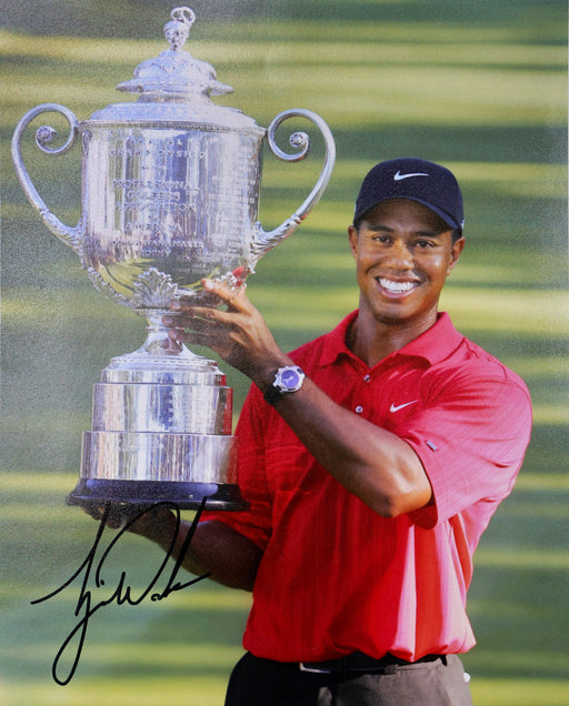 £950.00| /A superb Tiger Woods signed photo A large 10 x 8 inches. Full length colour promotional photograph of Woods lining up a putt while holding his p...