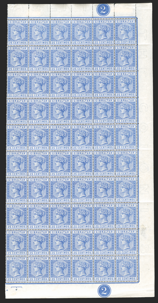 £1,750.00| /Gibraltar 1889-96 25c deep ultramarine, complete right pane of 60 (6x10) with full margins except at left, showing plate number '2' x2, SG26a. A br...