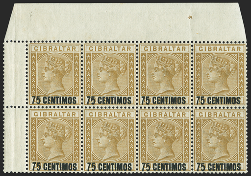 £495.00| /Gibraltar 1889 75c on 1s bistre, upper left corner block of 8 (4x2) from right pane, R1/2 and R2/2 (second column of the setting) showing the varie...