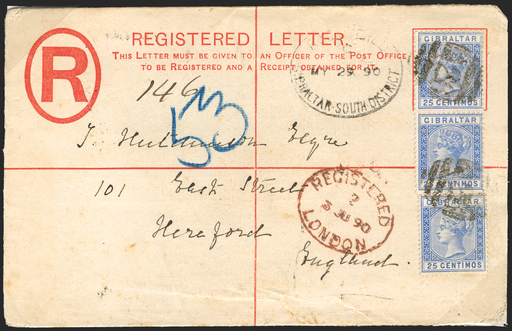 £175.00| /Gibraltar 1890 (MY 29) 20c red registered Postal Stationery envelope (size G), used to England, uprated with 1889-96 25c ultramarine, SG26 (x3, inc...
