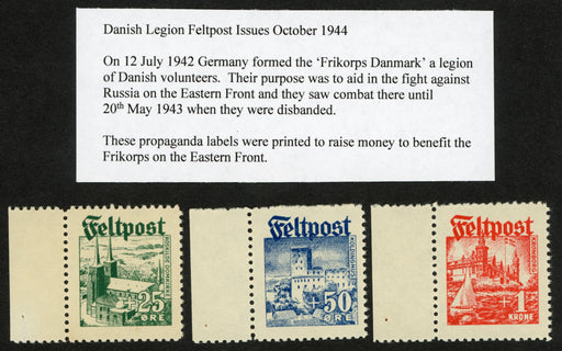 £895.00| /Germany 1944 (October) Danish Legion Feltpost +25 Ore to +1 Krone, left marginal set of three propaganda labels. A very fine and fresh unmounted mi...