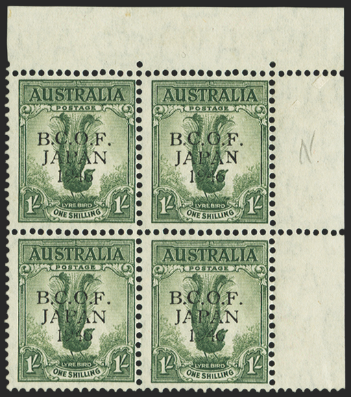 £375.00| /Australia British Commonwealth Occupation Force 1946-48 1s grey-green, upper right corner block of 4, upper right stamp (= right pane, R1/8) showin...