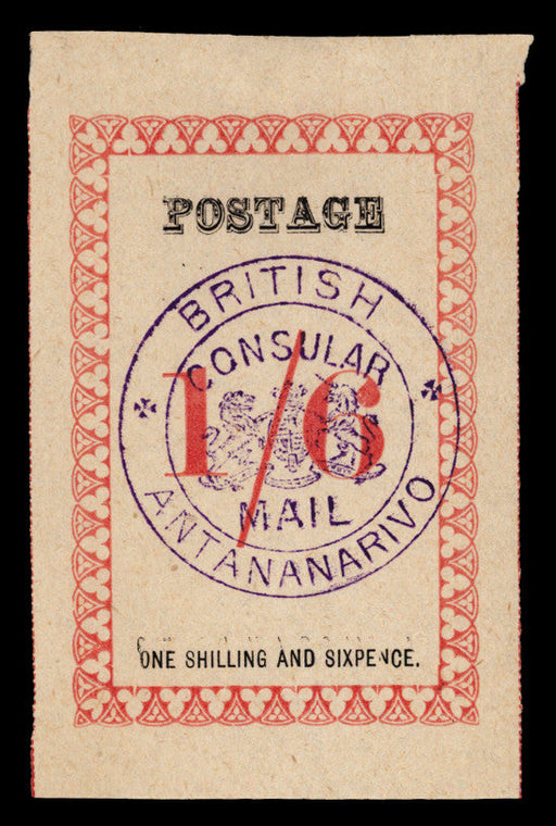 £1,700.00| /Madagascar 1886 1s 6d rose, "POSTAGE", SG46b, 24½mm, "CONSULAR MAIL" handstamp in violet. Very fine unused example with corner gumming intact. Rare...