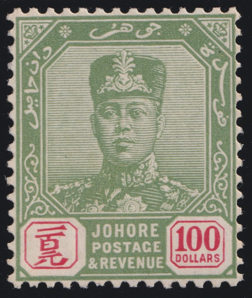 £2,250.00| /Malaya - Johore 1922-41 $100 green and scarlet "Sultan Sir Ibrahim", Script watermark, SG127. A fine mint example with original gum and centring fa...