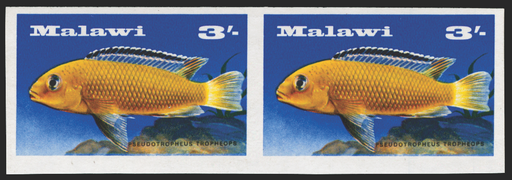 £350.00| /Malawi 1967 3s 'Orange Mbuna', IMPERFORATE horizontal pair, SG284a. Post Office fresh, unmounted mint with full original gum. A rare imperforate er...