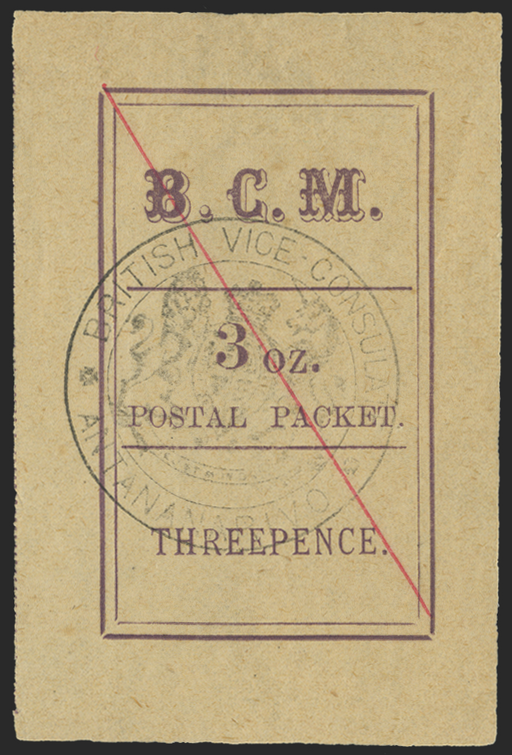 £325.00| /Madagascar 1884 3d (3oz) magenta "POSTAL PACKET", hand stamped "British Vice-Consulate", hollow stop after "B", cancelled by red ink line, with cor...