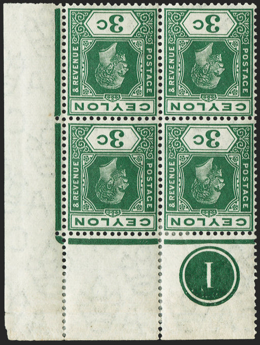 £140.00| /Ceylon 1912-25 3c blue-green (single plate), Watermark MCA, variety watermark inverted and reversed, upper right corner block of 4 with plate numbe...