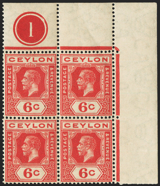 £195.00| /Ceylon 1912-25 6c pale scarlet (single plate), Watermark MCA, variety watermark sideways (to left from back), upper right corner block of 4 with pl...