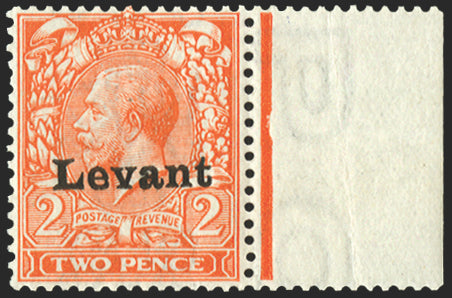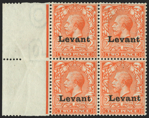 £900.00| /£900.00 British Levant 1916 2d reddish orange, type S1 'Salonica' overprint, left marginal block of 4, SGS3. A brilliant quality mint block of fo...