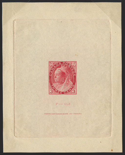 £950.00| /Canada 1898-1902 'Numerals' 3c die proof in carmine (issued colour) on India paper (75x95mm) showing complete die sinkage with Die number 'F-113' a...