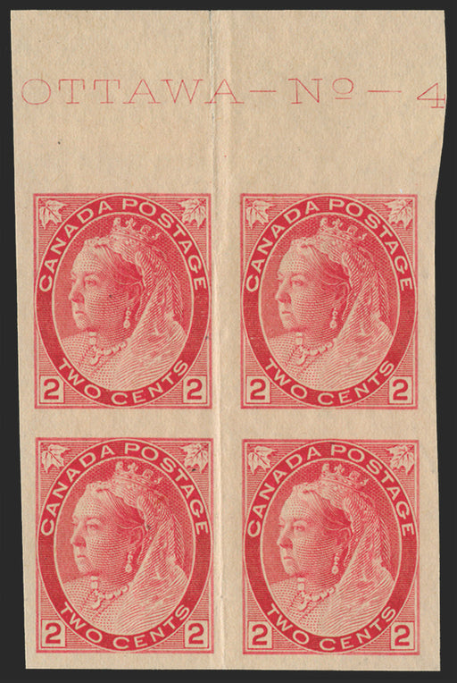 £1,100.00| /£1100.00 Canada 1898-1902 'Numerals' 2c rose-carmine, die Ia, upper marginal IMPERFORATE BLOCK OF 4 with IMPRINT and PLATE NUMBER 'OTTAWA-No.-4',...