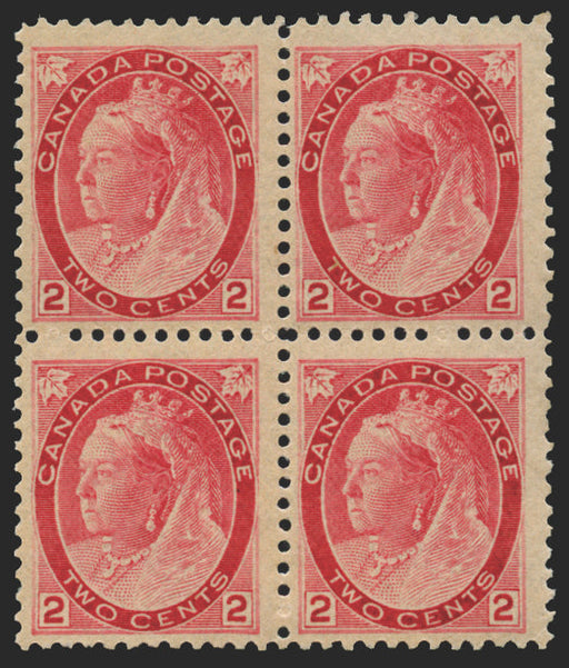 £120.00| /Canada 1898-1902 'Numerals' 2c rose-carmine, die Ia, SG155. A fine mint block of 4 with brilliant original gum and three stamps being unmounted min...