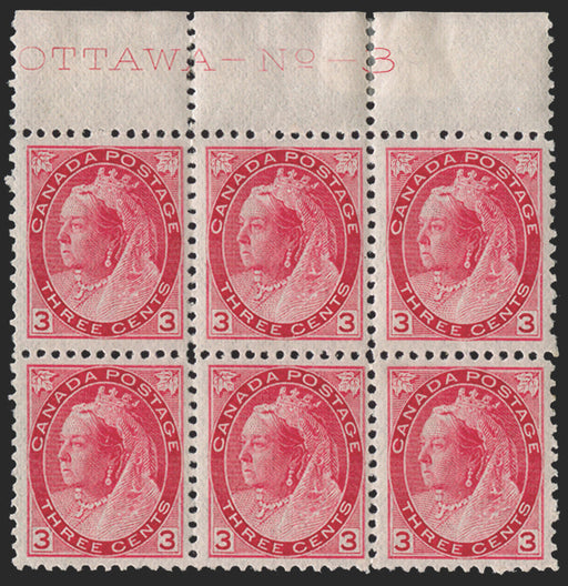 £550.00| /Canada 1898-1902 'Numerals' 3c rose-carmine, upper marginal block of 6 with complete 'OTTAWA-No-3' imprint and plate number, SG156. A brilliant qua...