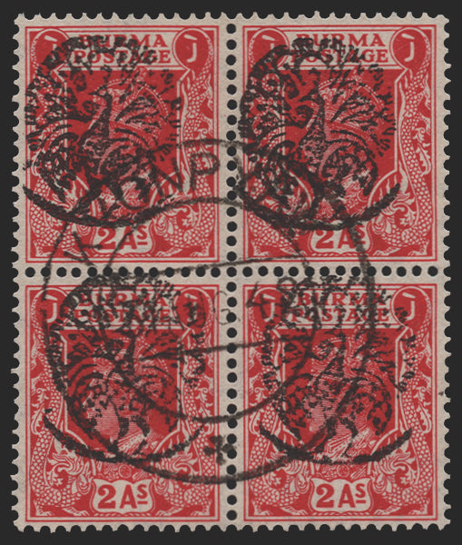 £325.00| /Japanese Occupation of Burma 1942 (May) 2a carmine, type 2 peacock of Myaungmya, block of 4, centrally cancelled by "KYONPYAW" circular date stamp,...