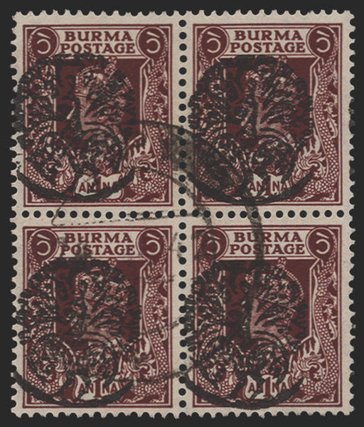 £250.00| /Japanese Occupation of Burma 1942 (May) 1a purple-brown, type 2 peacock of Myaungmya, block of 4, centrally cancelled by "KYONPYAW" circular date s...