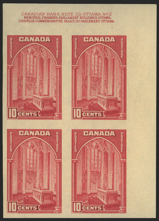 £1,750.00| /Canada 1937-38 10c rose-carmine, IMPERFORATE upper right corner plate "2" block of 4, SG363. Very fine unmounted mint block with full original gum....