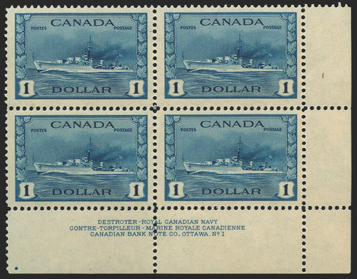 £250.00| /Canada 1942-48 War Effort $1 blue 'Destroyer', lower right corner plate and imprint block of 4, SG388. A very fine unmounted mint positional block ...