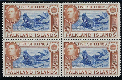 £600.00| /Falkland Islands 1938 50 blue and chestnut, "Southern Sea Lion", 1937 first printing, SG161. A superb quality block of 4 from the first printing of...
