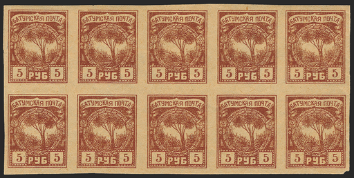 £125.00| /Batum British Occupation 1919 (4 Apr) 5r brown, block of 10 (5x2) showing transfers ABABA/CDCDC, SG6. A very fine unmounted mint block (except firs...