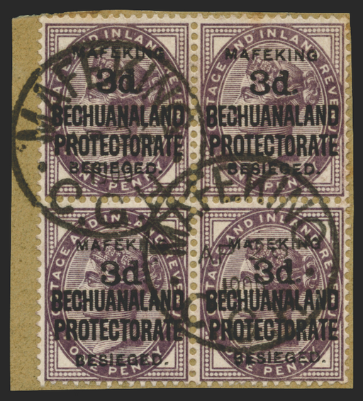 £550.00| /South Africa Cape of Good Hope - Mafeking Siege Stamps 1900 3d on 1d lilac Bechuanaland Protectorate, type 2 sans-serif surcharge, block of 4, tied...