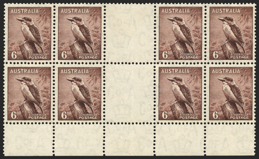 £275.00| /Australia 1937-49 6d purple-brown 'Kookaburra', perforations 13½ x 14, lower marginal inter pane-block of 8 (4x2) WITHOUT IMPRINT, SG172. A fine mi...