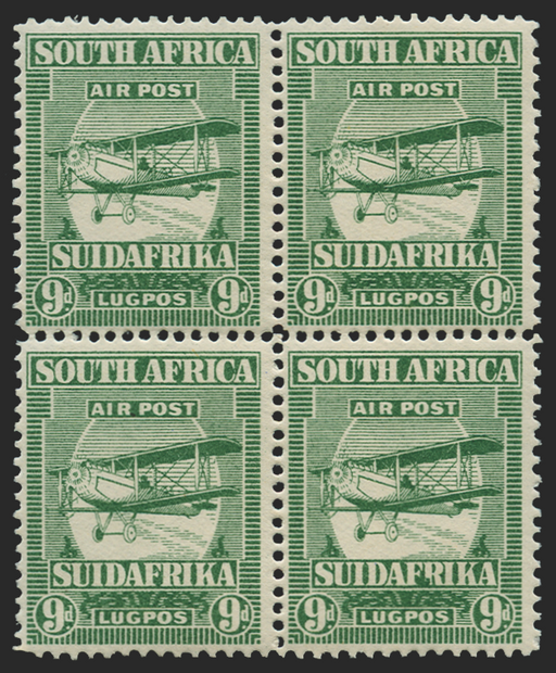 £125.00| /South Africa 1925 'Air Mail' 9d green, lower left corner block of 4, with lower right stamp (R12/8) showing "Broken R" in "SUIDAFRIKA" (Reference: ...