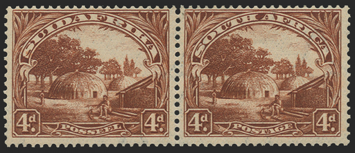 £900.00| /South Africa 1927-30 4d brown "A Native Kraal", recess printing, perforations 14x13½ (up), horizontal pair, VARIETY WATERMARK INVERTED, SG35bw. A f...
