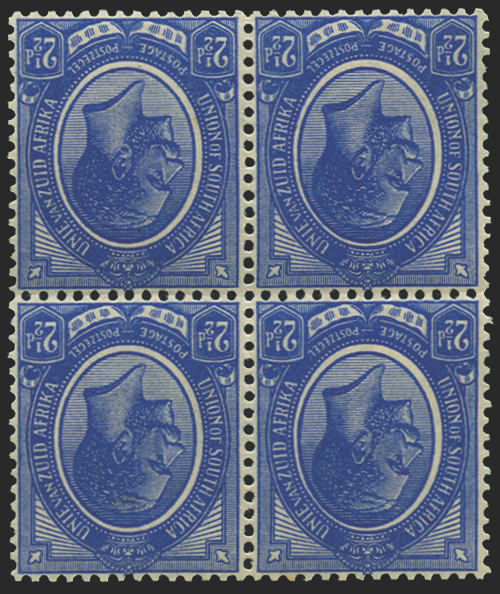 £550.00| /South Africa 1913-24 2½d deep blue, variety WATERMARK INVERTED, block of 4, SG7w. A fine unmounted mint block with full original gum. Fractionally ...