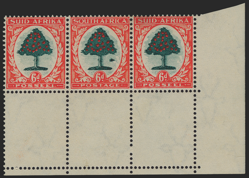 £275.00| /South Africa 1933-48 6d green and vermilion 'Orange Tree' (die I), 'SUID-AFRIKA' hyphenated, lower right corner horizontal strip of 3, middle stamp...