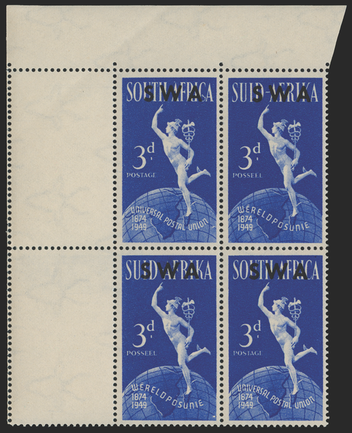 £65.00| /South West Africa 1949 75th Anniversary of the Universal Postal Union 3d bright blue, upper left corner block of 4, upper left stamp (R1/1) showing...
