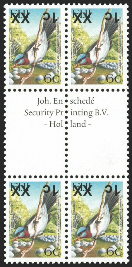 £225.00| /Fiji 2006-08 Local provisional "Birds" 1c on 6c, type IIc surcharge, error SURCHARGE INVERTED, interpane block of 4 with 'Enschede' imprint, SGF131...