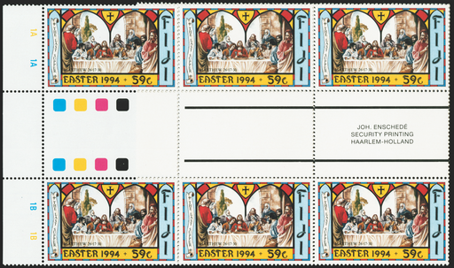 £70.00| /Fiji 1994 Easter 59c, variety watermark Crown to left of CA (from back), folded interpane block of 10 (5x2) with central gutter showing Enschede im...