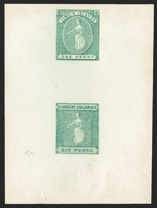 £700.00| /Virgin Islands 1866 1d and 6d engraved die proofs, printed se-tenant in green on card (64x86mm) with very large margins on three sides, SG1,3. A ra...