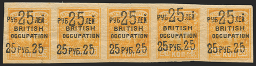£200.00| /Batum British Occupation 1920 (1 Apr) 25r on 25k orange-yellow, type 7 surcharge in black, horizontal strip of 5 (transfer types FDEFD), SG43. A ve...