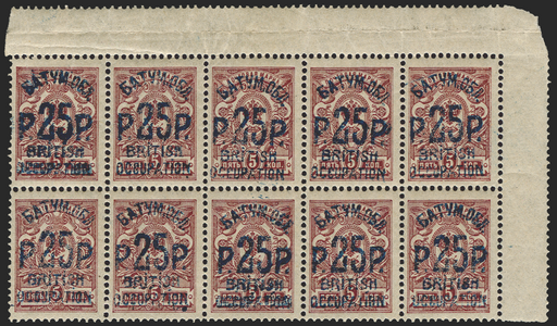 £650.00| /Batum British Occupation 1920 (21 Feb) 25r on 5k brown-lilac, surcharge as type 6 in blue, BLOCK OF TEN (5x2) from upper right corner of a pane, SG...