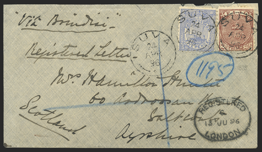 £450.00| /Fiji 1896 (24 APR) registered cover from Suva to Scotland, Hamilton Hunter correspondence, endorsed "Via Brindisi", correctly franked at 7½d (5d re...