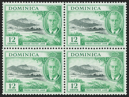 £950.00| /Dominica 1951 12c black and bright green, block of four, lower left stamp showing watermark error 'C' of 'CA' missing, SG128a. A very fine unmounte...
