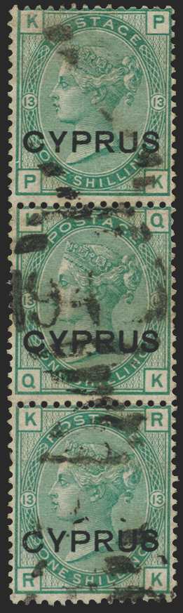 £950.00| /£950.00 Cyprus 1880 (1 Apr) 1s green, plate 13, vertical strip of 3 (PK/RK), SG6. A fine used strip with part '942' numerals of Larnaca which lea...