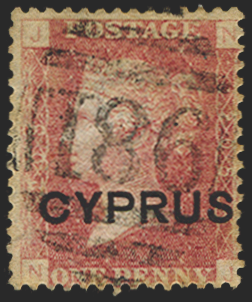 £75.00| /Cyprus 1880 1d red, plate 208, lettered 'NJ', lightly used with very fine virtually complete '981' of Papho, SG2. A desirable example of the first ...