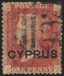 £150.00| /Cyprus 1880 1d red, plate 220, lettered 'JG', SG2. A well-centred and lightly used example with fine part '982' of Famagusta. Small imperfections (...