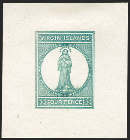 £400.00| /£400.00 Virgin Islands 1867-70 4d engraved die proof in green, on card (44x47mm), SG15. A fine and very scarce die proof printed from the master ...