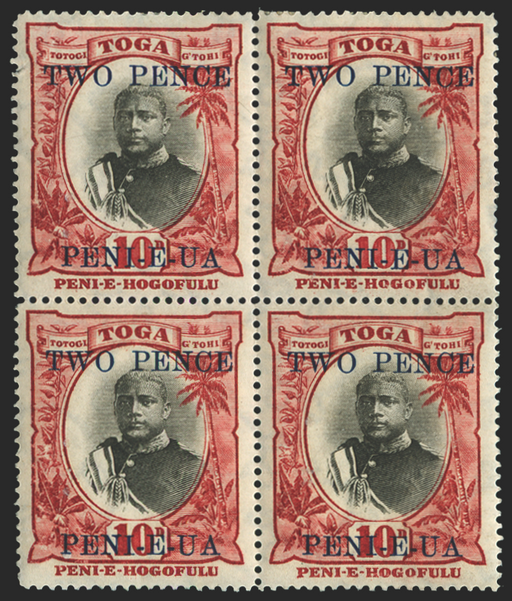£195.00| /Tonga 1923-24 2d on 10d black and lake, type 27 surcharge in blue, watermark upright (inverted), block of 4, positions 6-7/16-17 on the sheet, show...