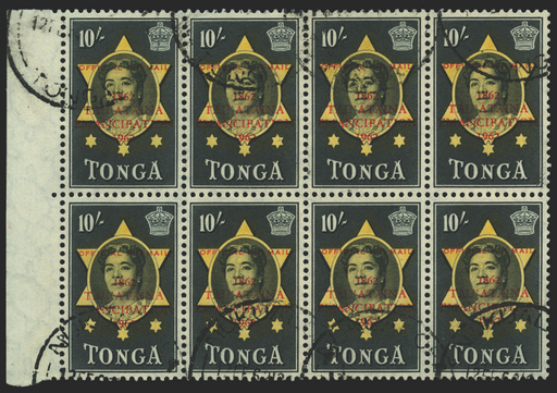 £225.00| /Tonga 1962 (7 Feb) "Emancipation" Air 10s yellow and black Official, type O3 overprint, left marginal block of 8 (4x2) from R3-4/1-4 of the 6x5 set...