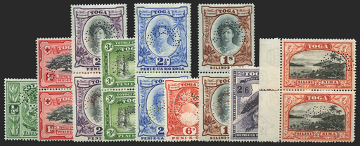 £500.00| /Tonga 1942-49 set of 9 to 5s, script watermark, perforated "SPECIMEN" (type D21), exceptionally in horizontal (½d, 6d, 2s6d) or vertical pairs, SG7...