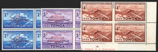 £225.00| /Tonga 1962 (7 Feb) "Emancipation" Air Officials, 2d ultramarine, 5d violet, 1s red-brown, type O3 overprint, in right marginal blocks of 4, the 2d ...