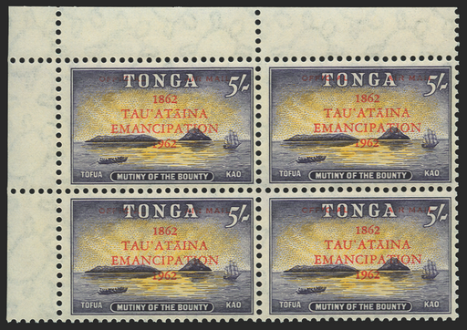 £500.00| /Tonga 1962 (7 Feb) "Emancipation" Air 5s orange-yellow and slate-lilac Official, type O3 overprint, upper left corner block of 4, SGO14. A fine unm...